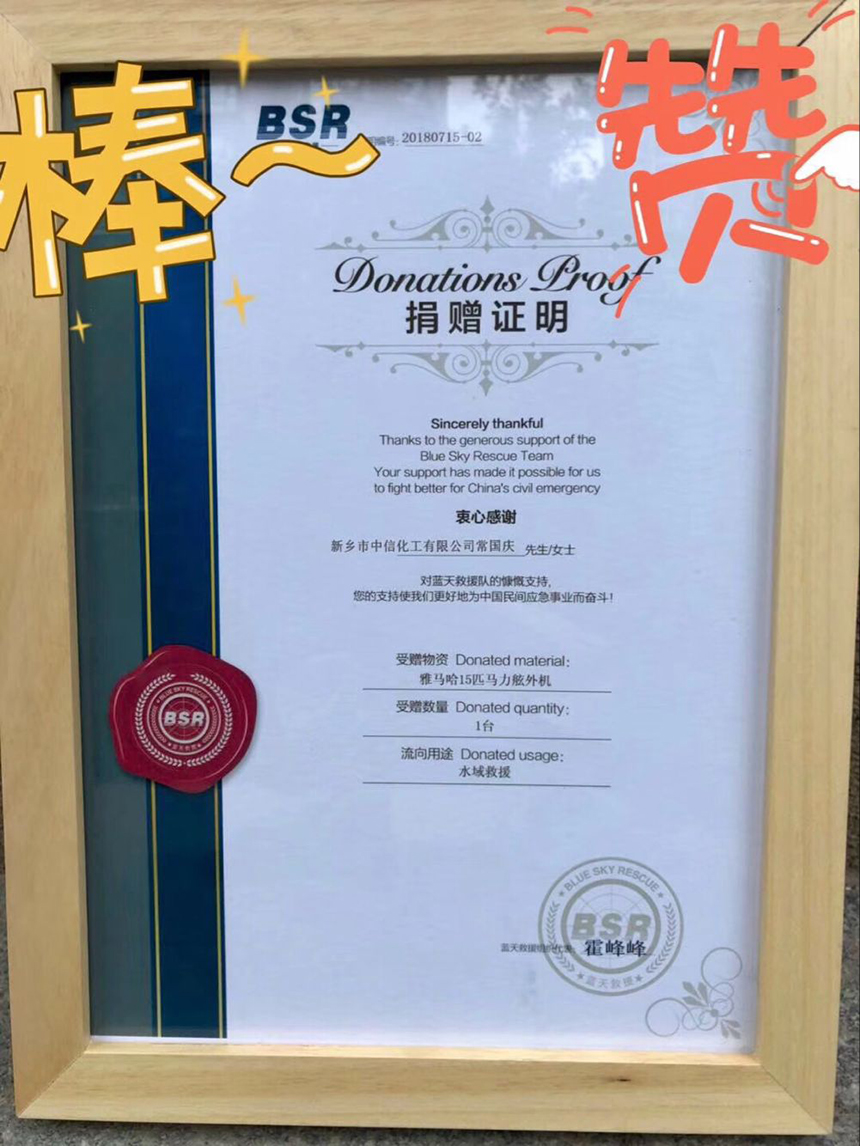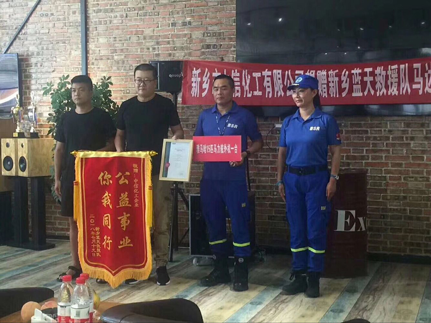 感恩生命,感恩生命中有您。中信化工一直心系社會(huì ),堅持社會(huì )公益,此次中信領(lǐng)導層來(lái)到新鄉藍天救援隊,向救援隊捐贈雅馬哈15匹馬力舷外機,幫助救援隊更好的水上救援。